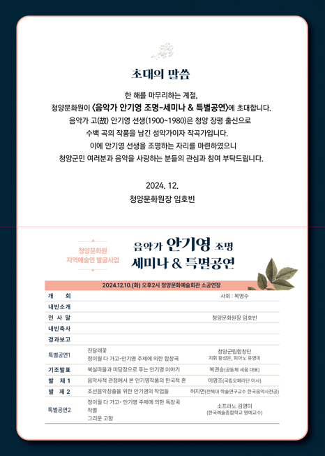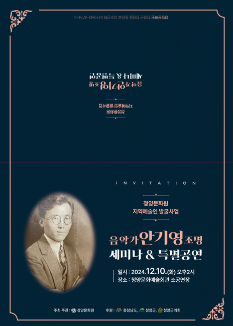 청양출신 음악가 안기영선생님의 세미나와 특별 공연의 자리를 청양문화원에서 마련하였으니 회원님들과 군민들의 많은 관심과 참석 부탁드립니다. 감사합니다. |