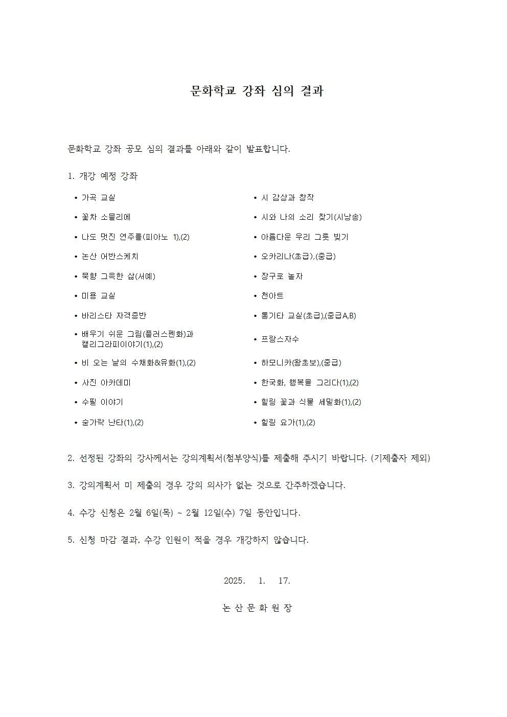 | 제목 | 2025. 문화학교 강좌 선정 심의 결과 | ||||