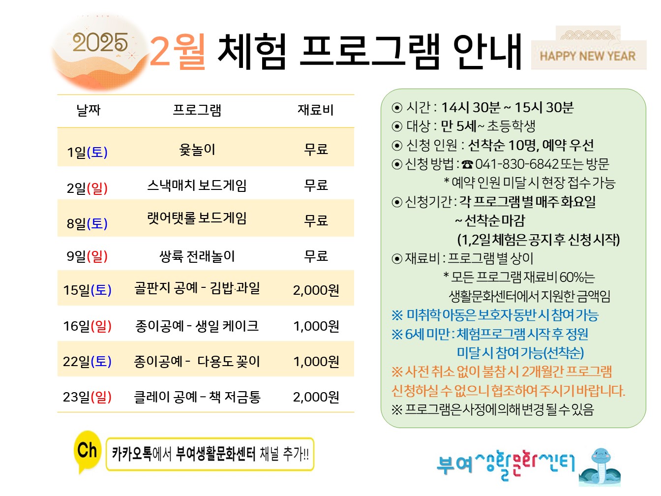 『 2025년 2월 체험프로그램 안내 』글의 상세내용을 확인하는 표로 제목, 작성자, 등록일, 조회, 첨부, 내용으로 나뉘어 설명합니다.