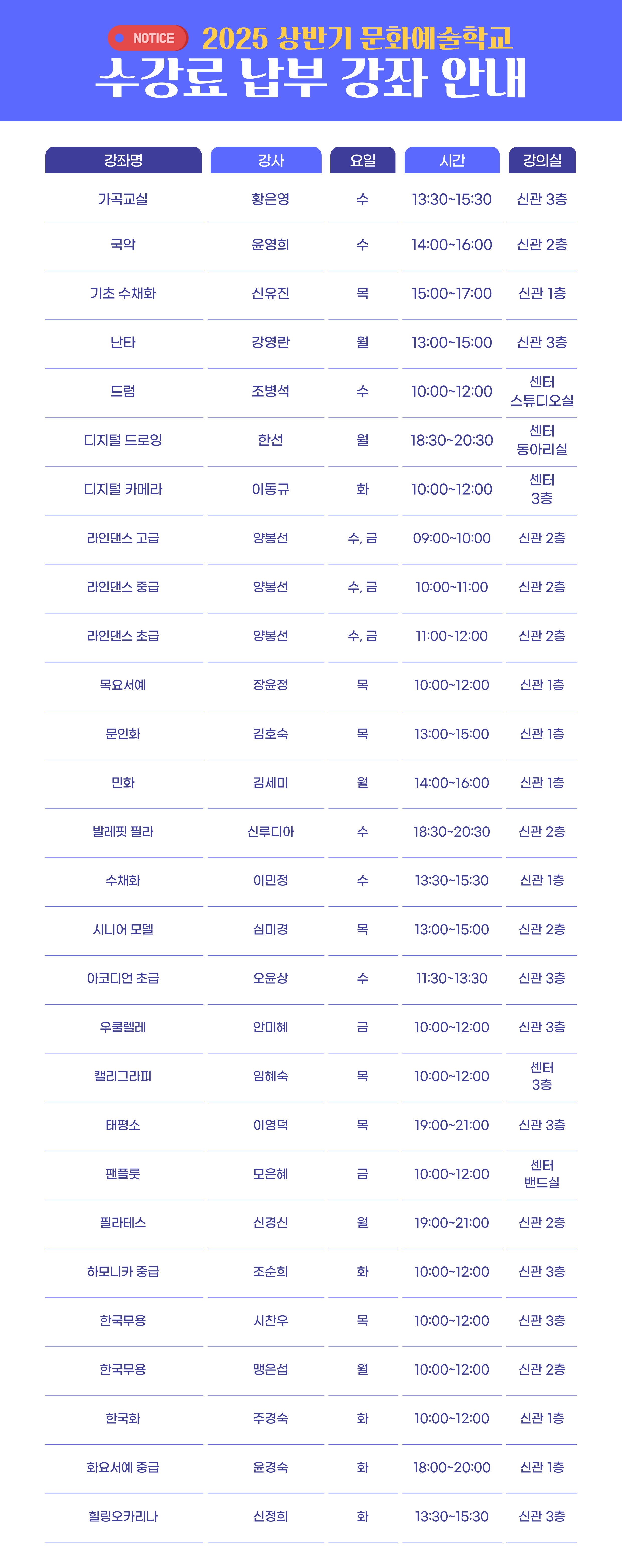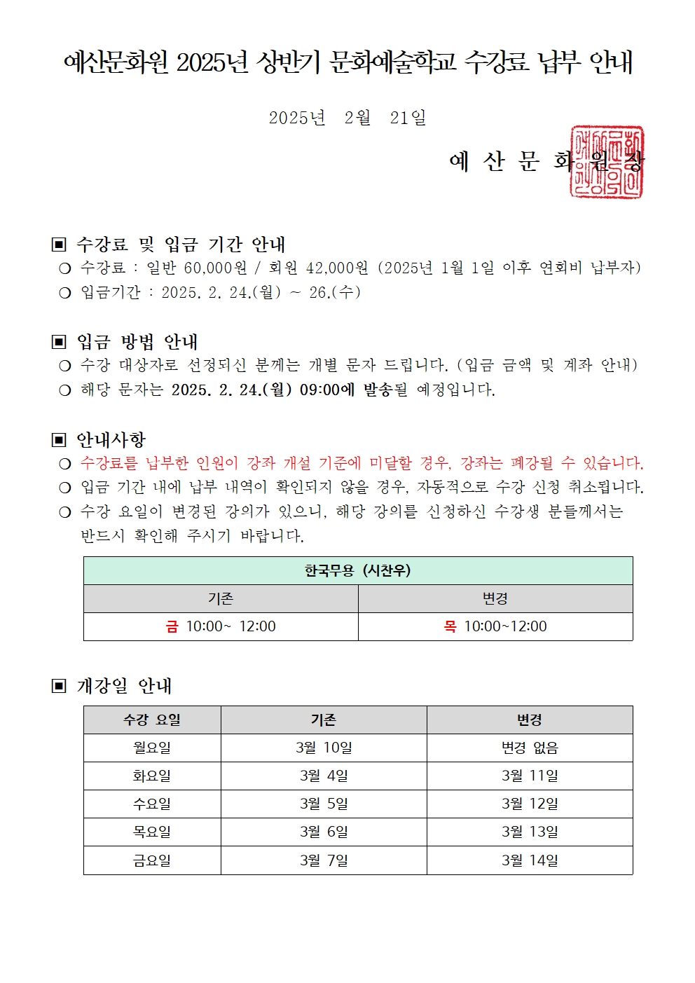 『 2025 상반기 문화예술학교 수강료 납부 안내 』글의 상세내용을 확인하는 표로 제목, 작성자, 등록일, 조회, 첨부, 내용으로 나뉘어 설명합니다.
