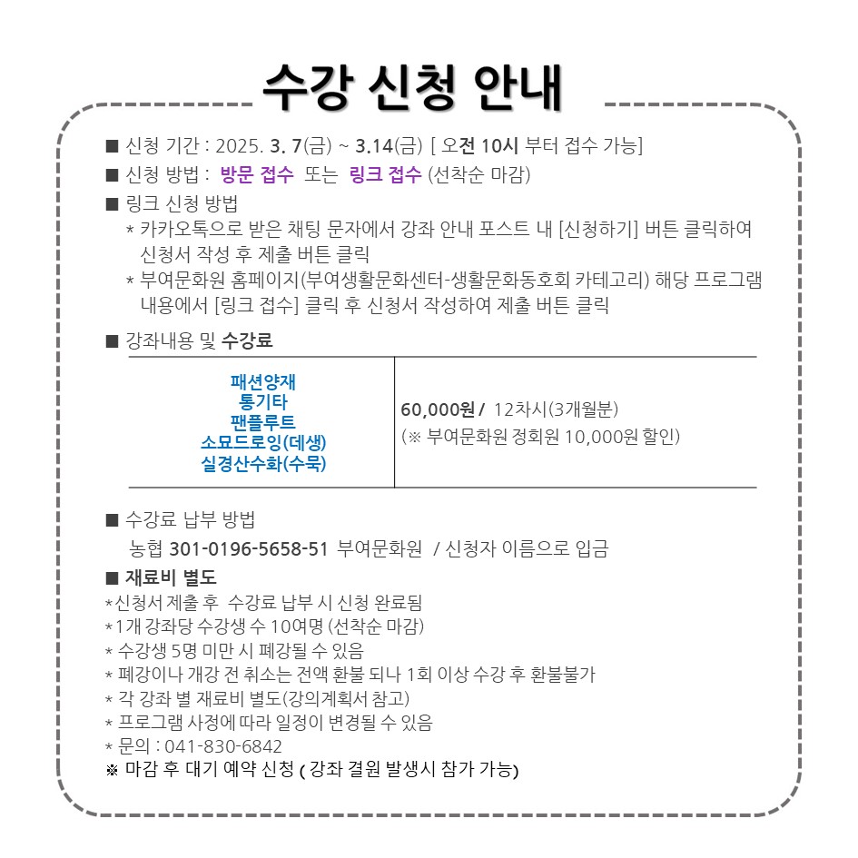 『 2025년 상반기 생활문화강좌 수강생 모집안내 』글의 상세내용을 확인하는 표로 제목, 작성자, 등록일, 조회, 첨부, 내용으로 나뉘어 설명합니다.