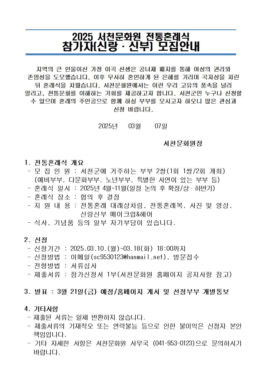 | 제목 | 2025 서천문화원 전통혼례식 참가자[신랑·신부]모집 안내 | ||||