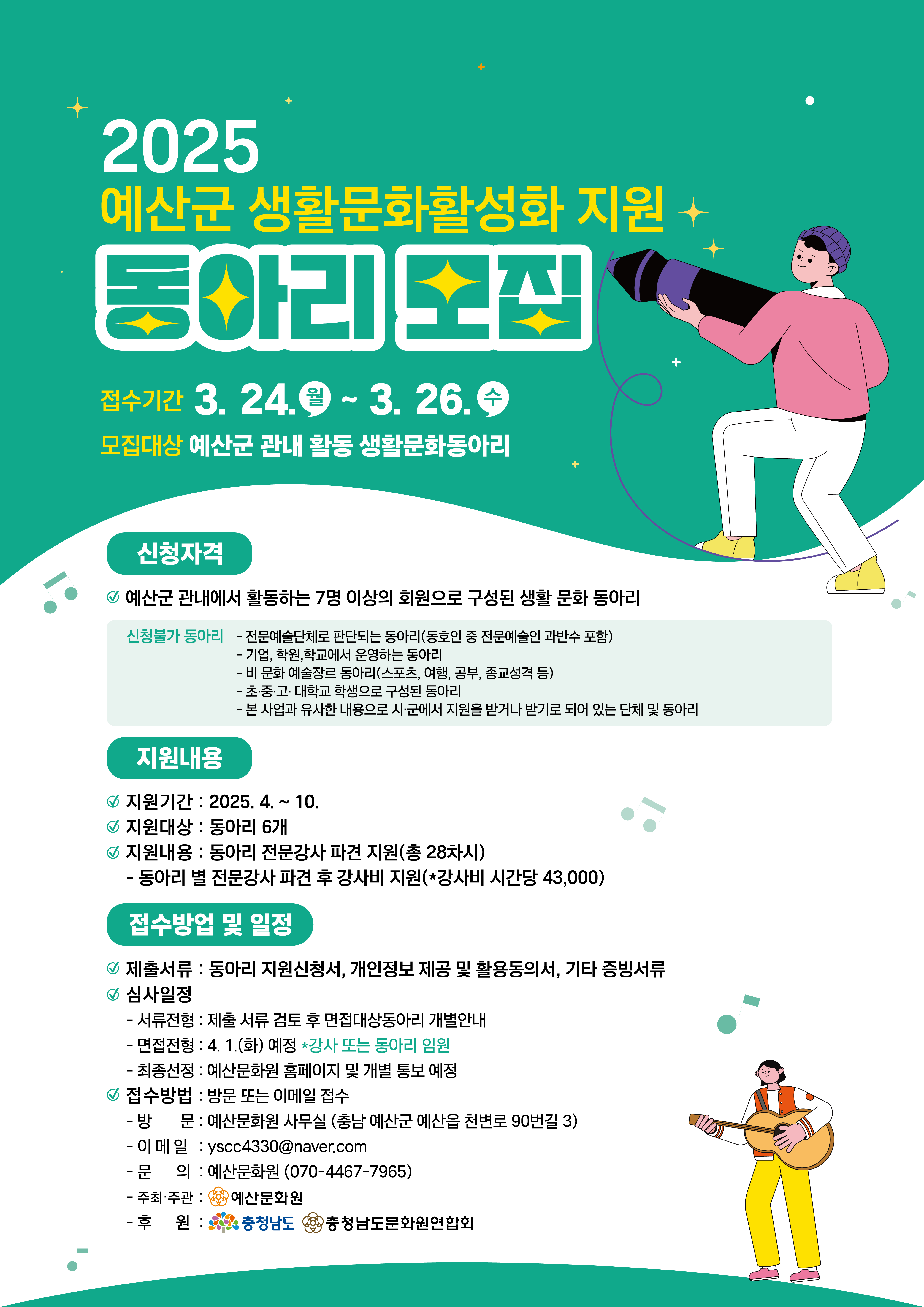 | 제목 | [모집공고] 2025 예산군 생활문화활성화 지원 사업 | ||||