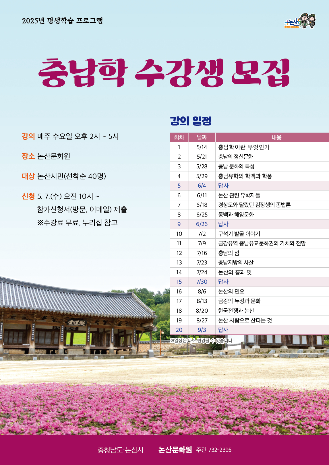 | 제목 | 2025. 충남학(논산학)강좌 수강생 모집 | ||||