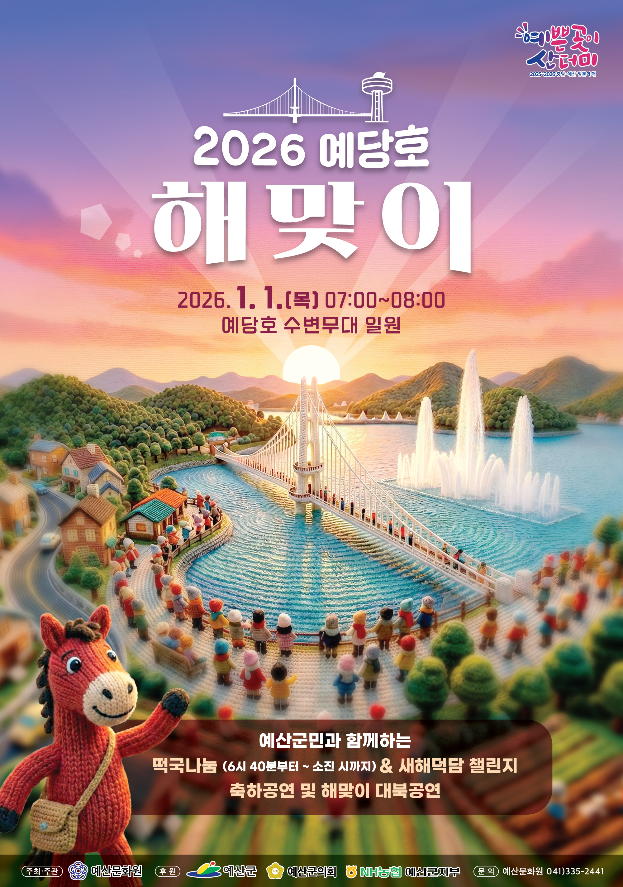 - 일 시 : 2026. 1. 1.(목) 07:00 ~ 08:00 - 장 소 : 예당호 수변무대 일원 - 내 용 ▷ 떡국나눔 : 6시 40분 ~ 소진시까지 ▷ 새해덕담챌린지 ▷ 축하공연 및 해맞이 대북공연