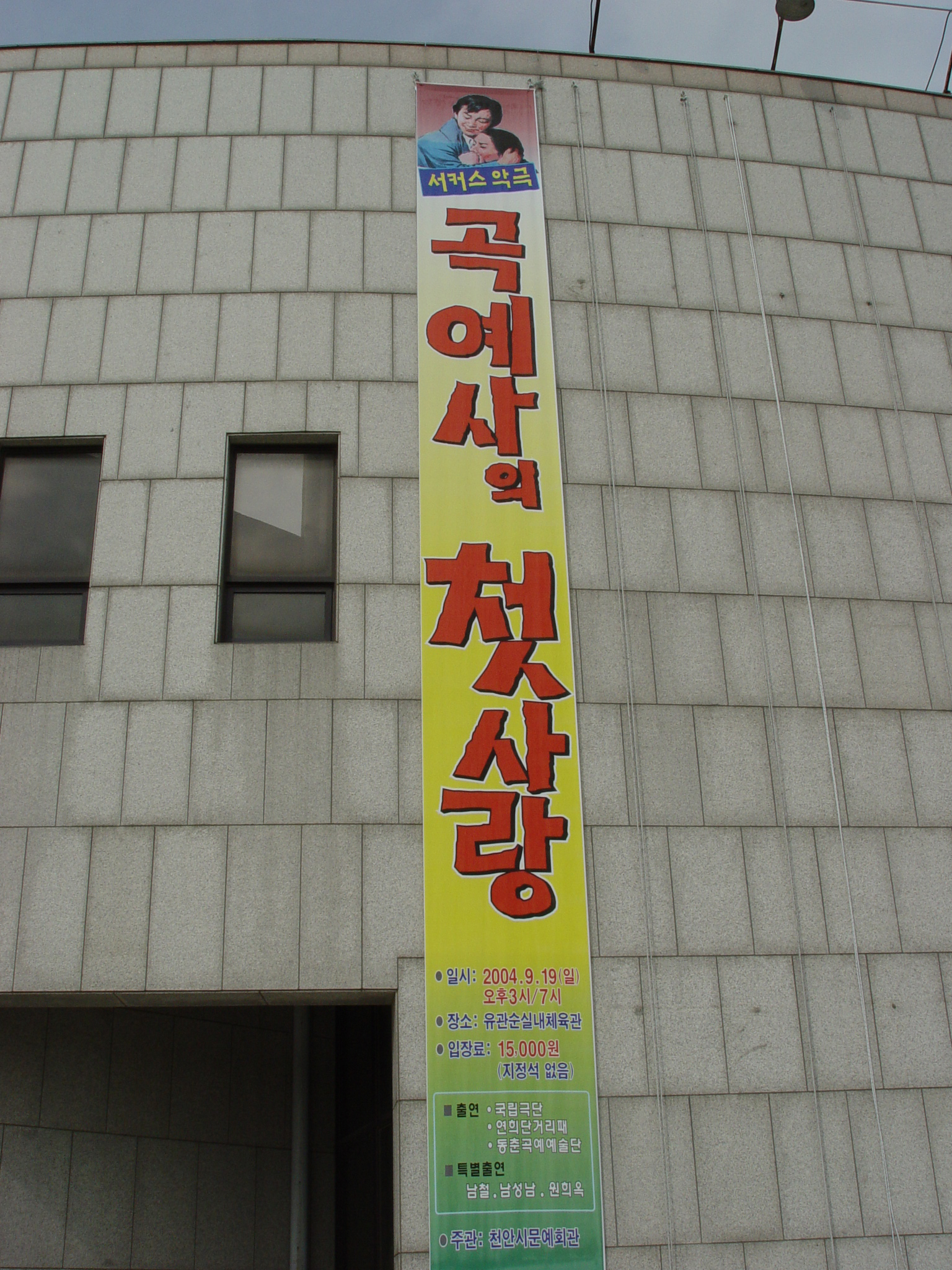 ○ 일 시: 2004. 9. 19(일요일) 오후 3시 / 7시 (1일 2회) ○ 장 소: 유관순 실내체육관(종합운동장내) ○ 관람료: 15,000원 (지정좌석 없음) ※ 할인: 10매이상 문예회관구입 10%, 3. 1일이후 타시.군전 입 30% 할인 ○ 공연시간: 150분(2시간 30분:15분 휴식) ○ 출연진 : 국립극단, 연희단 거리패, 동춘곡예 예술단 등 40명