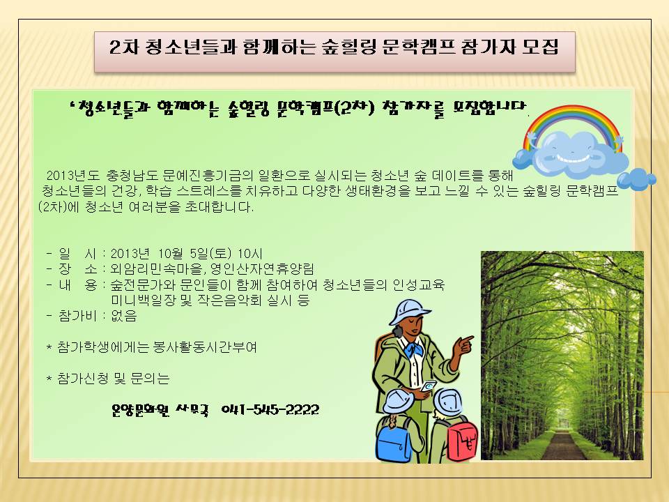 『 2차 청소년들과 함께하는 숲힐링 문학캠프 참가자 모집 』글의 상세내용을 확인하는 표로 제목, 작성자, 등록일, 조회, 첨부, 내용으로 나뉘어 설명합니다.