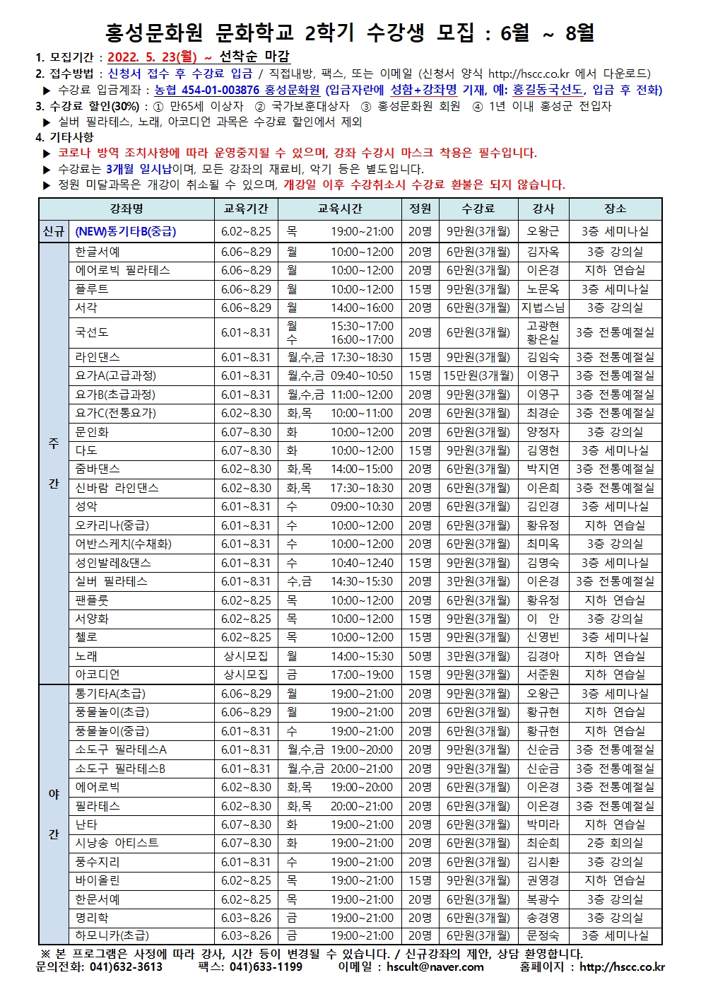 2022년 2학기 문화학교 수강생 모집 안내 ○ 모집기간 : 2022. 5. 23(월) ~ 정원내 선착순 마감. ○ 교육기간 : 2022. 6. 1(수)부터 개강 ○ 접수방법 : 방문 및 온라인 접수 가능, 정원내 선착순 마감 ▶ 신청서 접수 후 수강료 완납시 접수처리, 우선 입금자부터 적용 ▶ 수강신청서를 홍성문화원 홈페이지에서 다운로드 받아 작성 후 팩스 또는 이메일 발송 ▶ 팩스 : 041)633-1199, 이메일 : hscult@naver.com ▶ 수강료 입금계좌 : 농협 454-01-003876 홍성문화원 (이름+강좌명 꼭 기재) ○ 접수문의 : 홍성문화원 사무국(☎ 632-3613), 자세한 모집강좌 내용은 첨부파일 참조 ○ 수강료감면 : ① 만65세 이상자 ② 국가보훈대상자 ③ 홍성문화원 회원 ④ 1년 이내 홍성군 전입자는 30% 할인(중복감면 없음) ▶ 단, 교과목 중 실버 필라테싱, 아코디언, 노래 과목은 제외 ○ 기타사항 ▶ 강좌 수강시 마스크 착용은 필수입니다. ▶ 모든 강좌는 3개월 일시납입니다. ▶ 등록인원이 정원의 미달일 경우 해당과목은 폐강될 수 있습니다. ▶ 모든 강좌의 교재비, 재료비, 악기 등은 별도이며, 수강생 부담입니다. ▶ 수강취소 및 환불은 개강일 전날까지만 가능합니다. ▶ 특별한 사유 없이 수강취소시 수강자격이 제한될 수 있습니다. ※ 신규강좌 개설에 관한 제안이나 상담 가능합니다. ※ 본 프로그램은 문화원 사정에 따라 강사, 강의시간 등이 변경될 수 있습니다.
