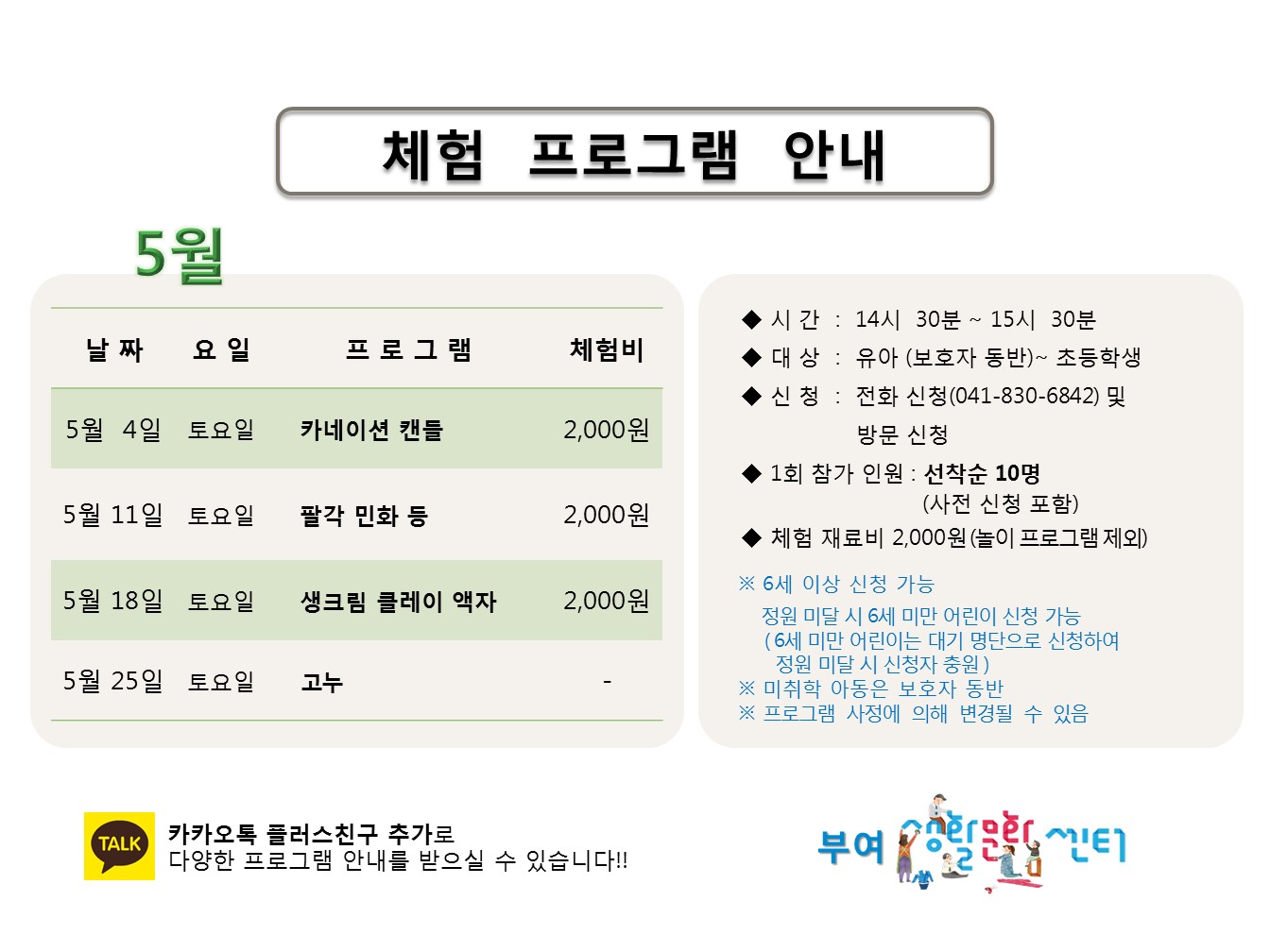 『 2019년 5월 체험프로그램 안내(종료) 』글의 상세내용을 확인하는 표로 제목, 작성자, 등록일, 조회, 첨부, 내용으로 나뉘어 설명합니다.