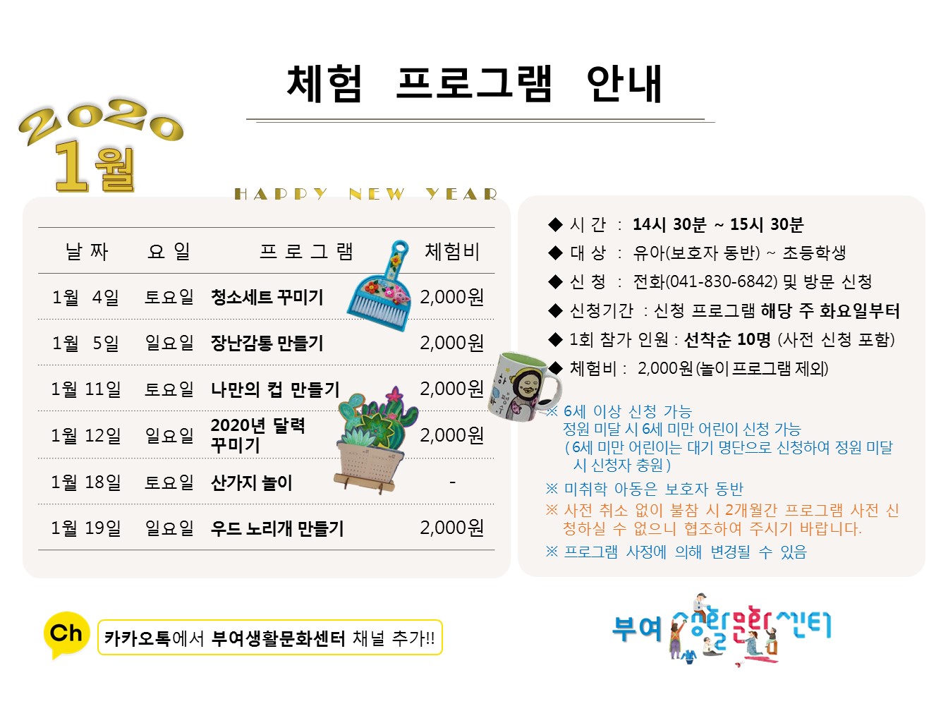 『 2020년 1월 체험프로그램 안내(종료) 』글의 상세내용을 확인하는 표로 제목, 작성자, 등록일, 조회, 첨부, 내용으로 나뉘어 설명합니다.