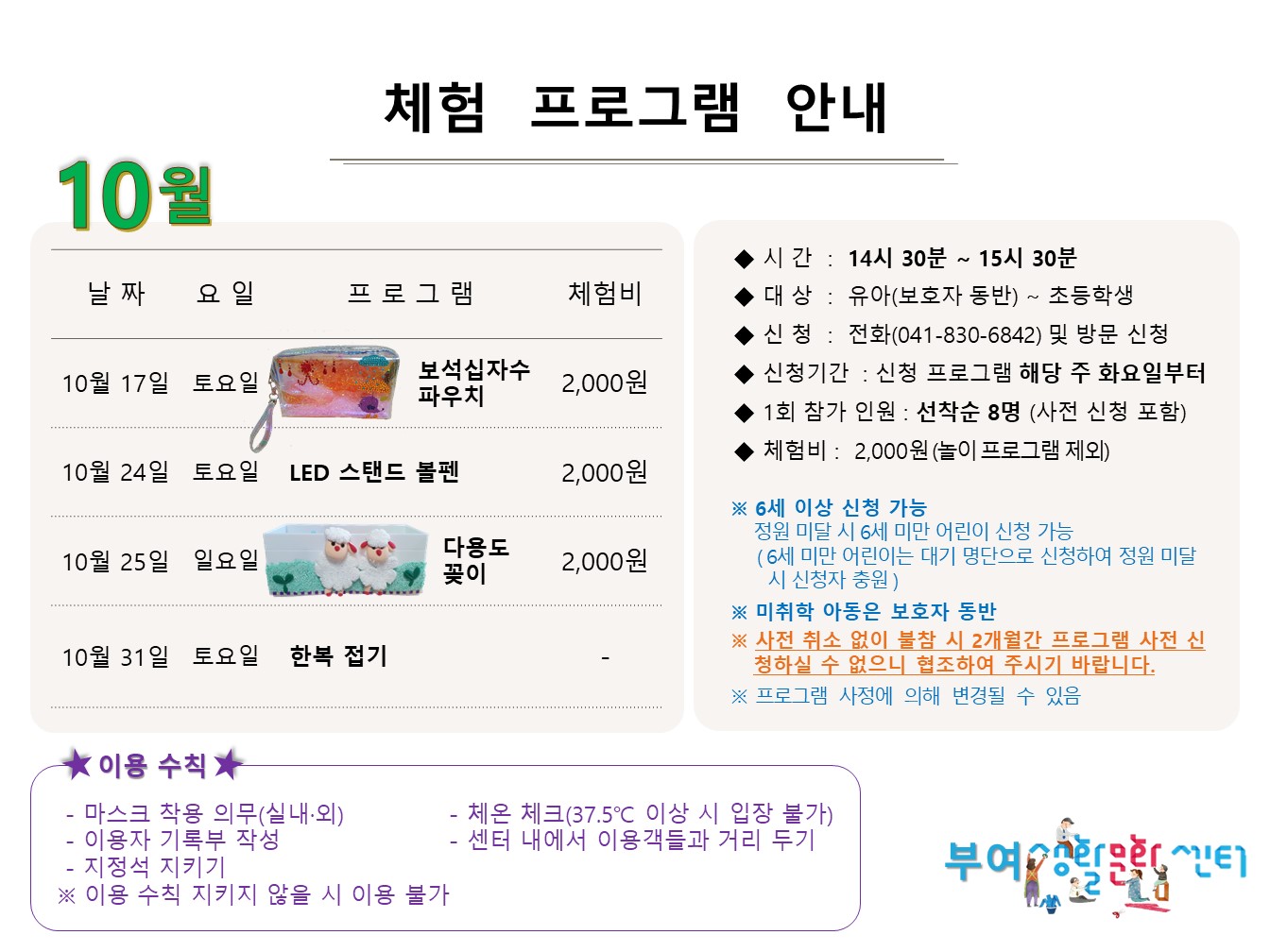 『 2020년 10월 체험프로그램 안내 』글의 상세내용을 확인하는 표로 제목, 작성자, 등록일, 조회, 첨부, 내용으로 나뉘어 설명합니다.