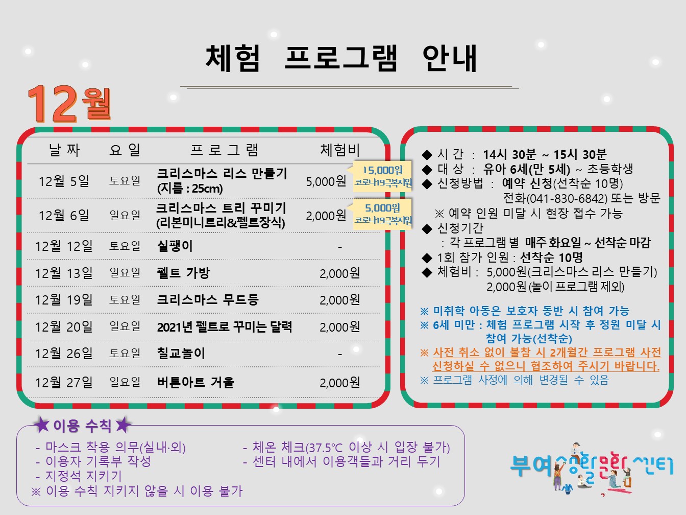 『 2020년 12월 체험프로그램 』글의 상세내용을 확인하는 표로 제목, 작성자, 등록일, 조회, 첨부, 내용으로 나뉘어 설명합니다.