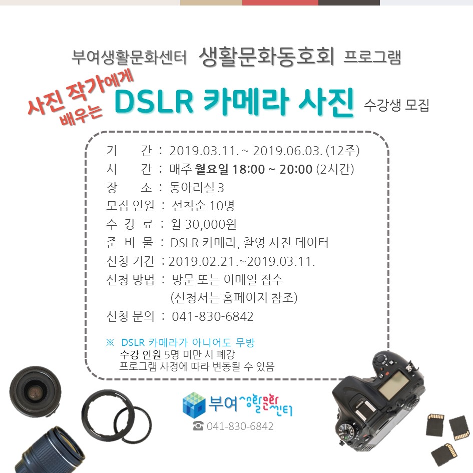 | 제목 | [2019년 상반기] DSLR 사진 수강생 모집(종료) | ||||