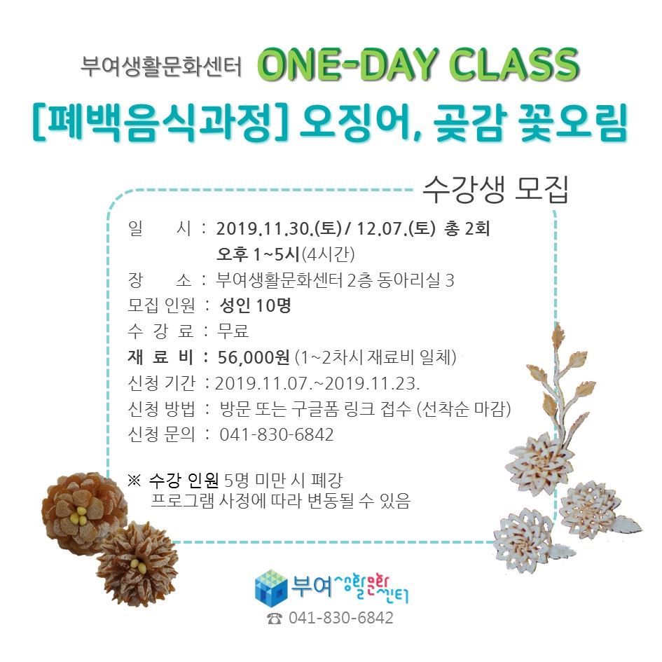 『 ONE-DAY CLASS [폐백음식과정] 오징어, 곶감 꽃오림 』글의 상세내용을 확인하는 표로 제목, 작성자, 등록일, 조회, 첨부, 내용으로 나뉘어 설명합니다.