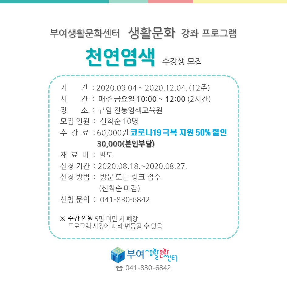 | 제목 | [2020년] 천연염색 수강생 모집(잠정 연기) | ||||
