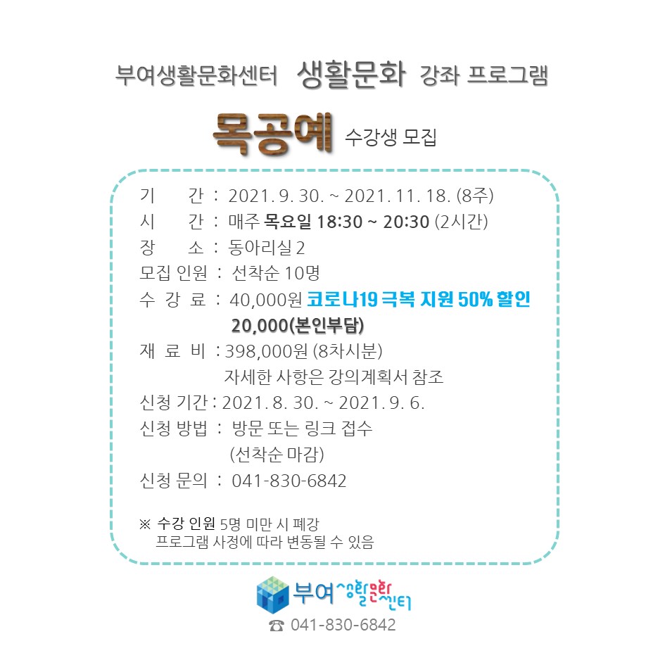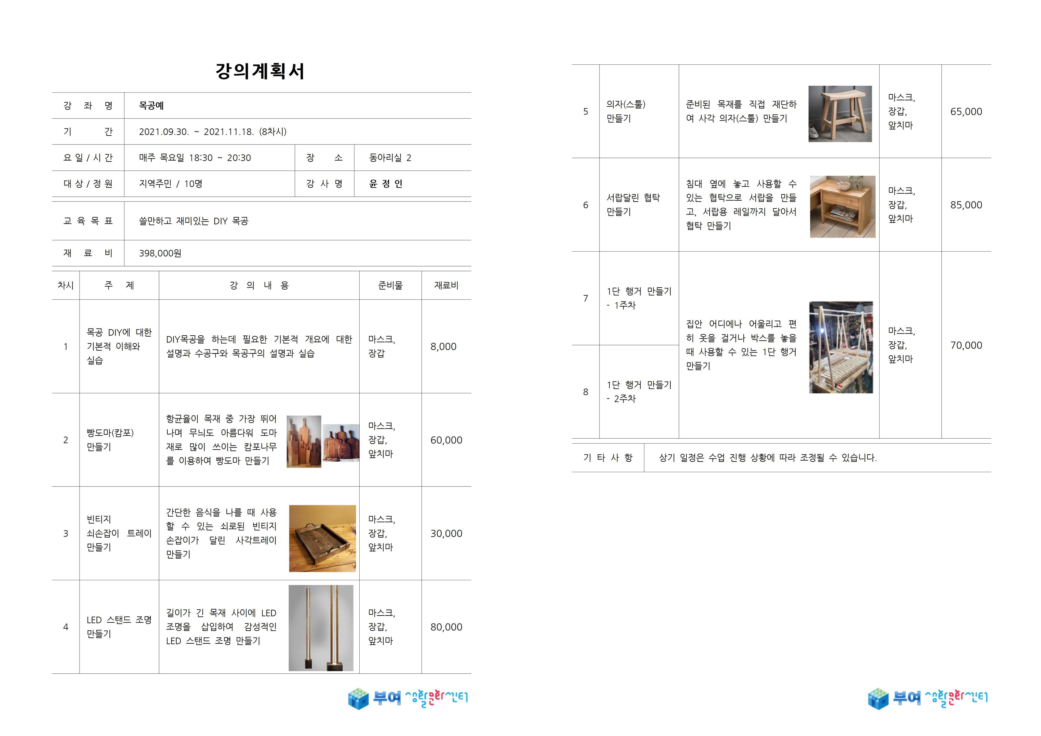 『 [2021년 하반기] 목공예 수강생 모집 』글의 상세내용을 확인하는 표로 제목, 작성자, 등록일, 조회, 첨부, 내용으로 나뉘어 설명합니다.