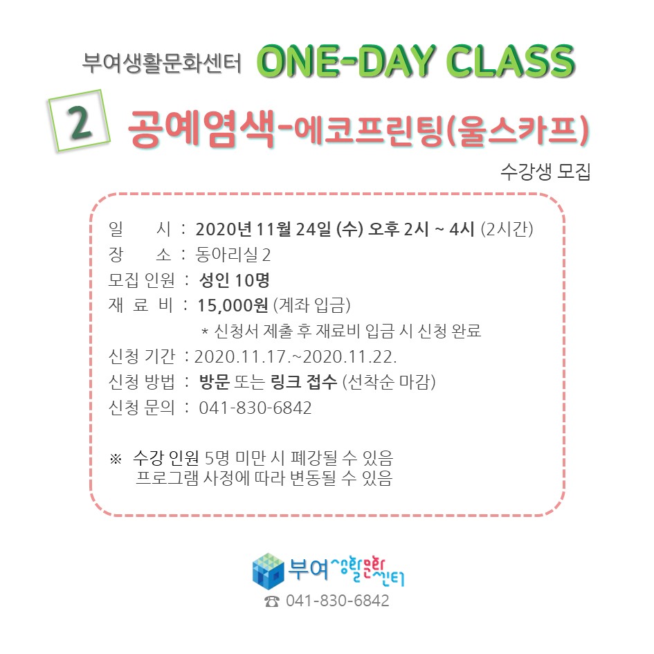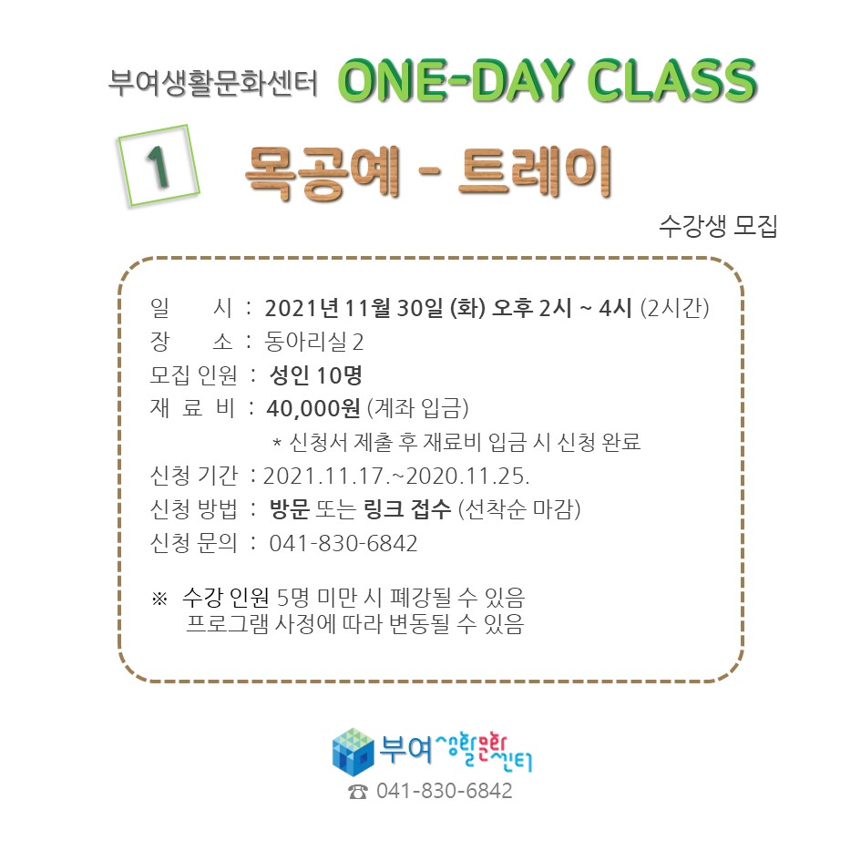 | 제목 | [원데이 클래스] 목공예, 공예염색 수강생 모집 | ||||