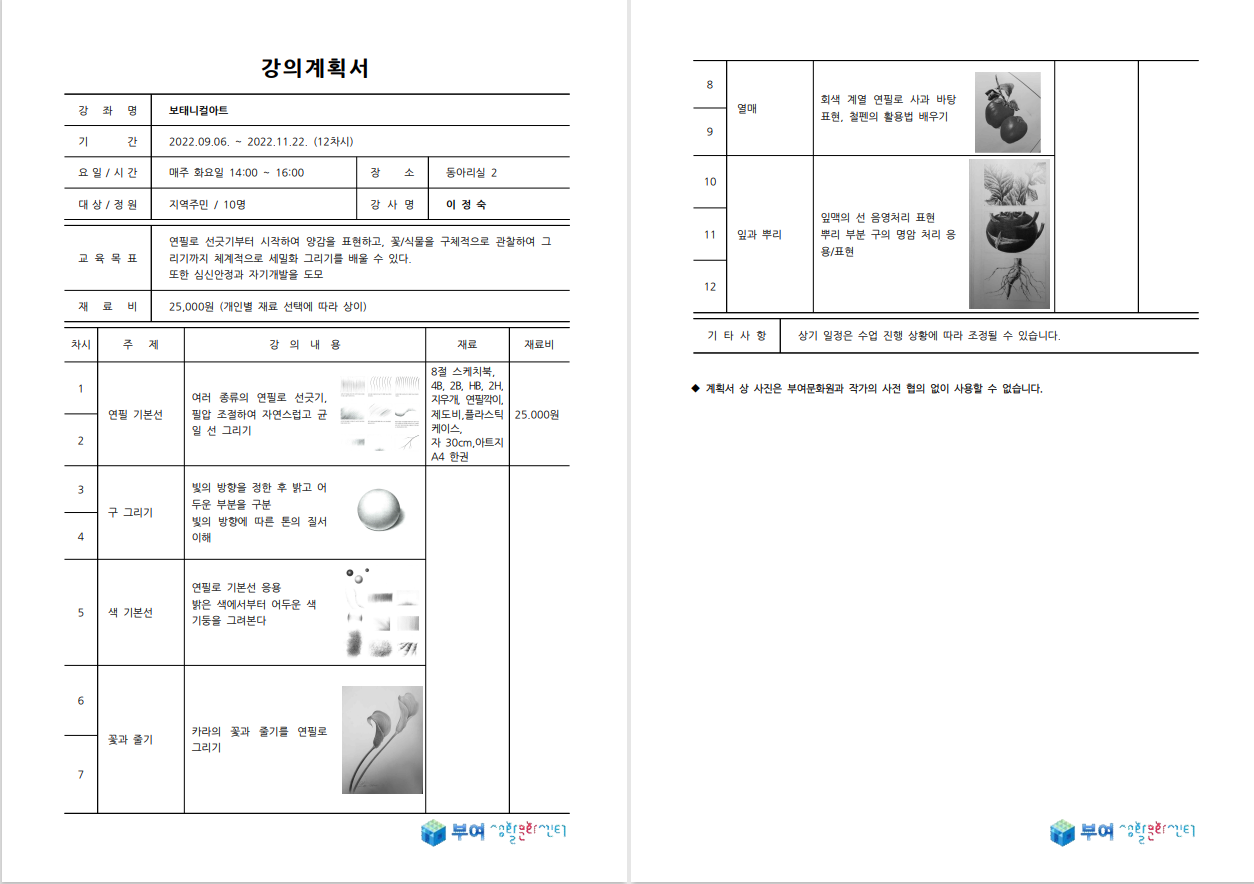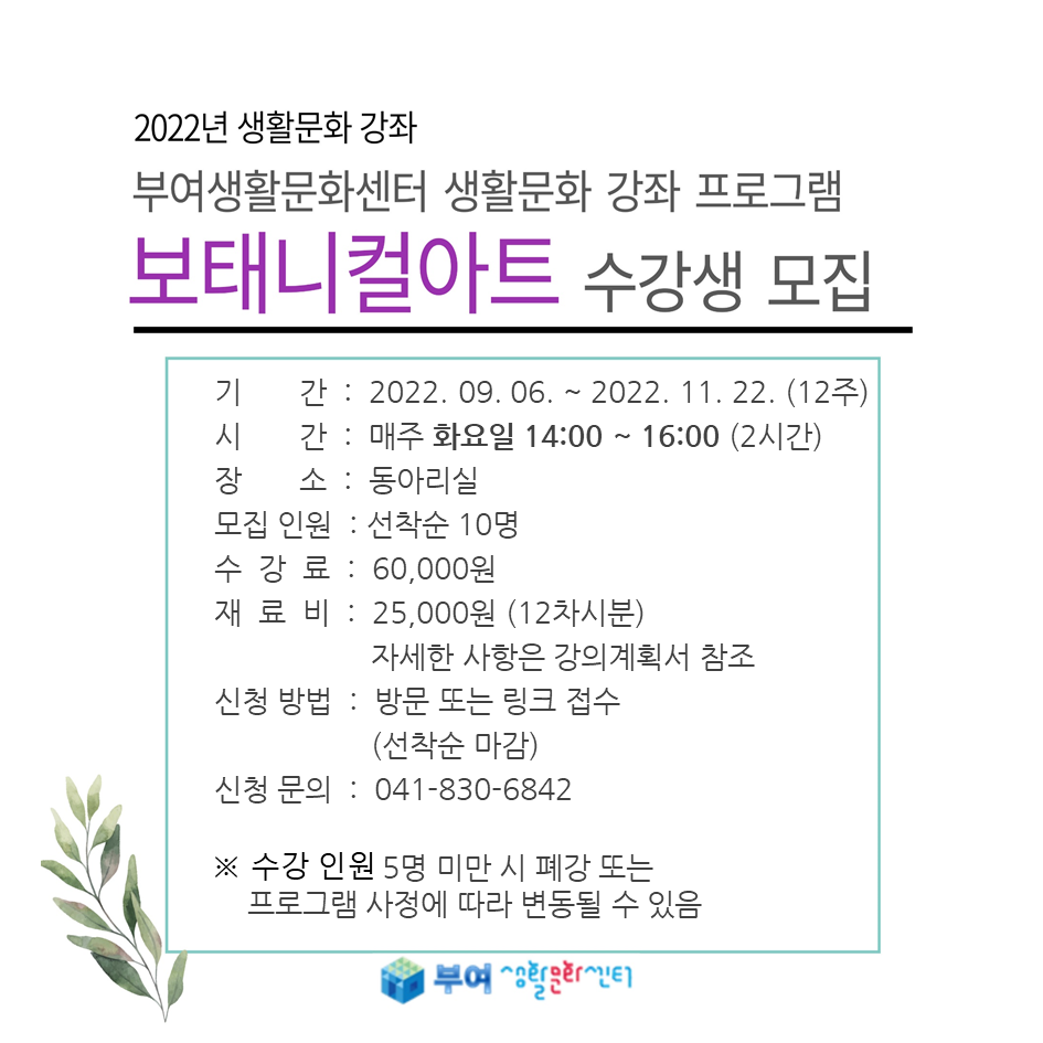 『 [2022년 생활문화강좌 보태니컬아트 수강생 모집] 』글의 상세내용을 확인하는 표로 제목, 작성자, 등록일, 조회, 첨부, 내용으로 나뉘어 설명합니다.