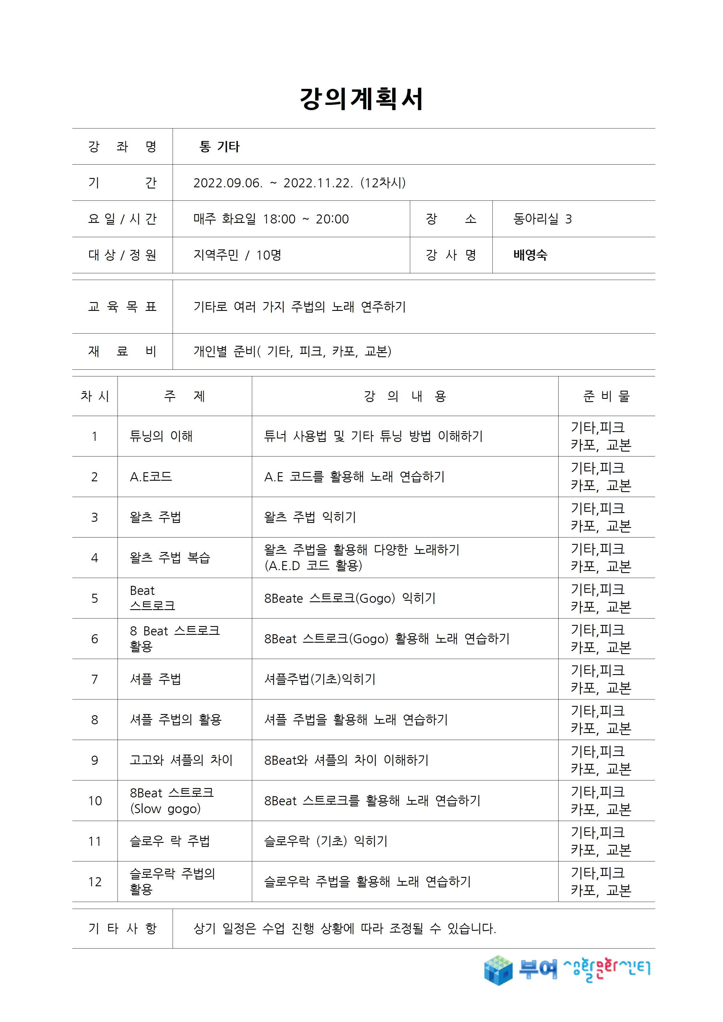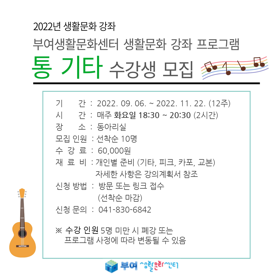 『 [2022년 생활문화강좌 통기타 수강생 모집] 』글의 상세내용을 확인하는 표로 제목, 작성자, 등록일, 조회, 첨부, 내용으로 나뉘어 설명합니다.