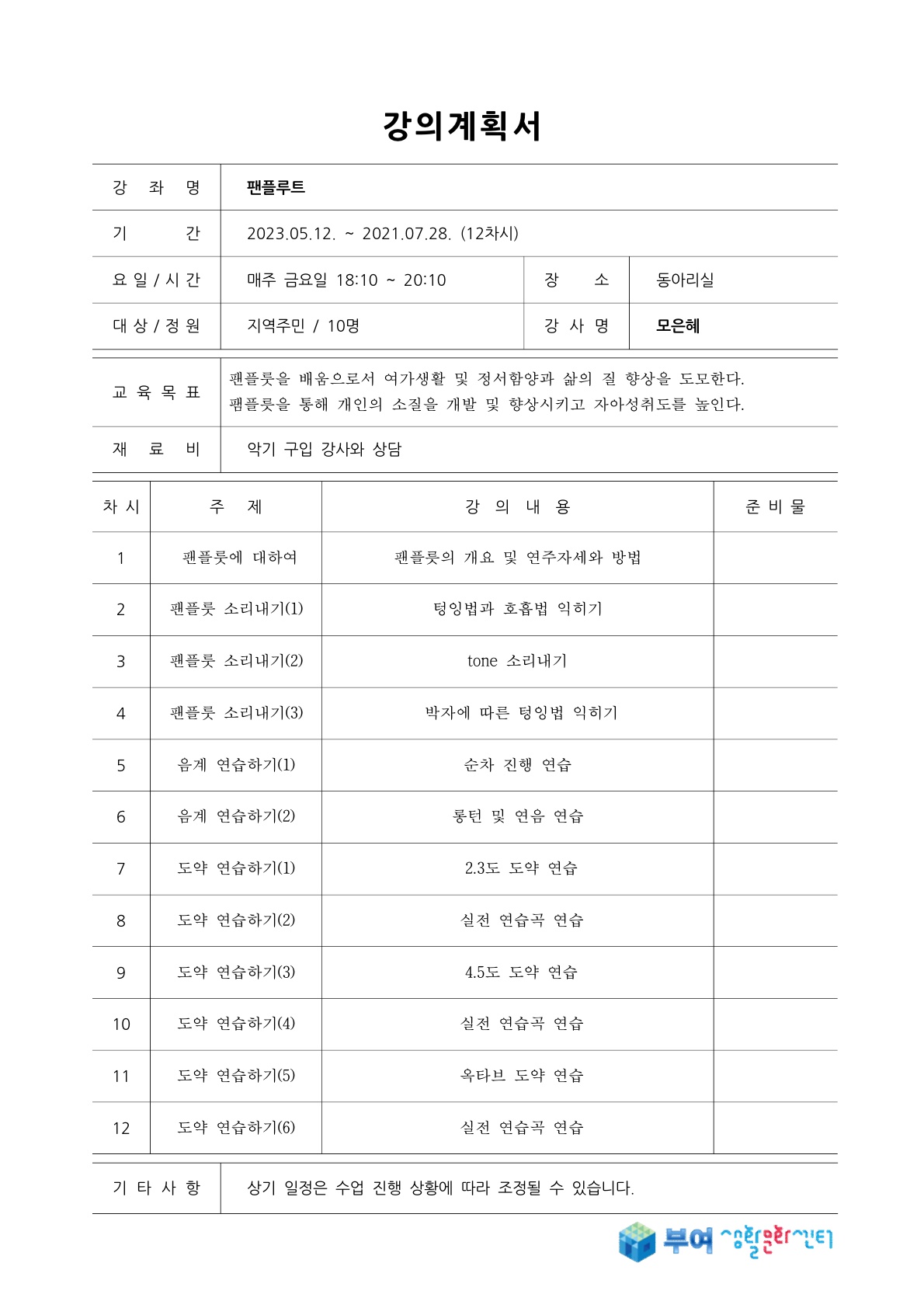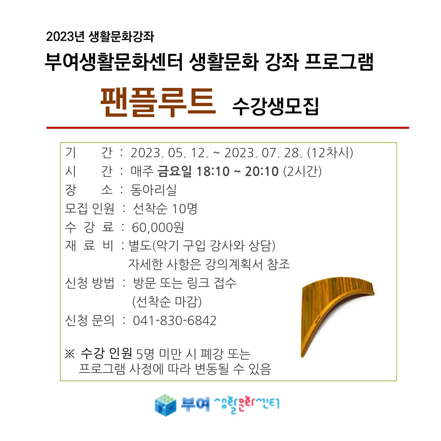 『 [2023년 생활문화강좌 팬플루트 수강생 모집] 』글의 상세내용을 확인하는 표로 제목, 작성자, 등록일, 조회, 첨부, 내용으로 나뉘어 설명합니다.
