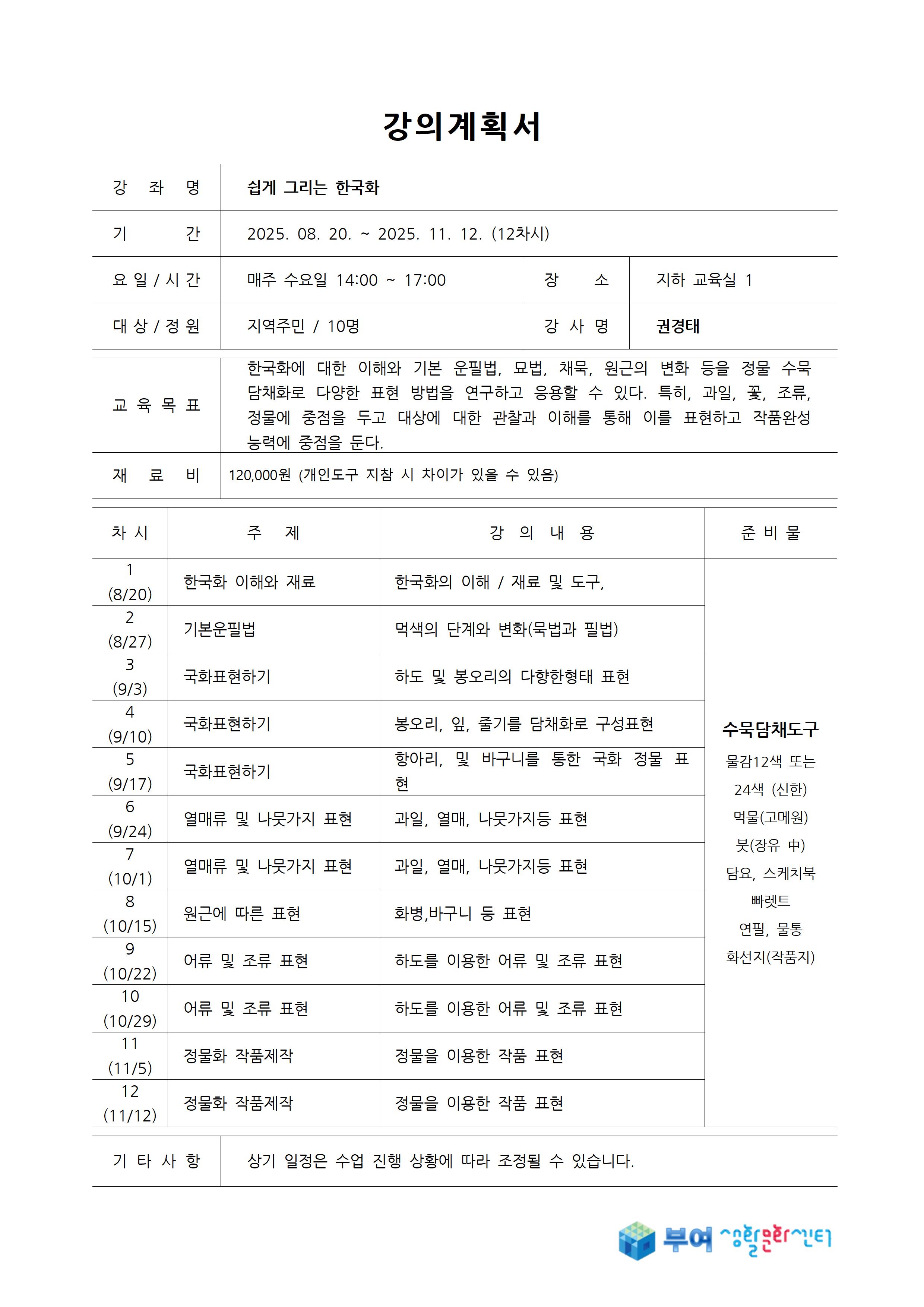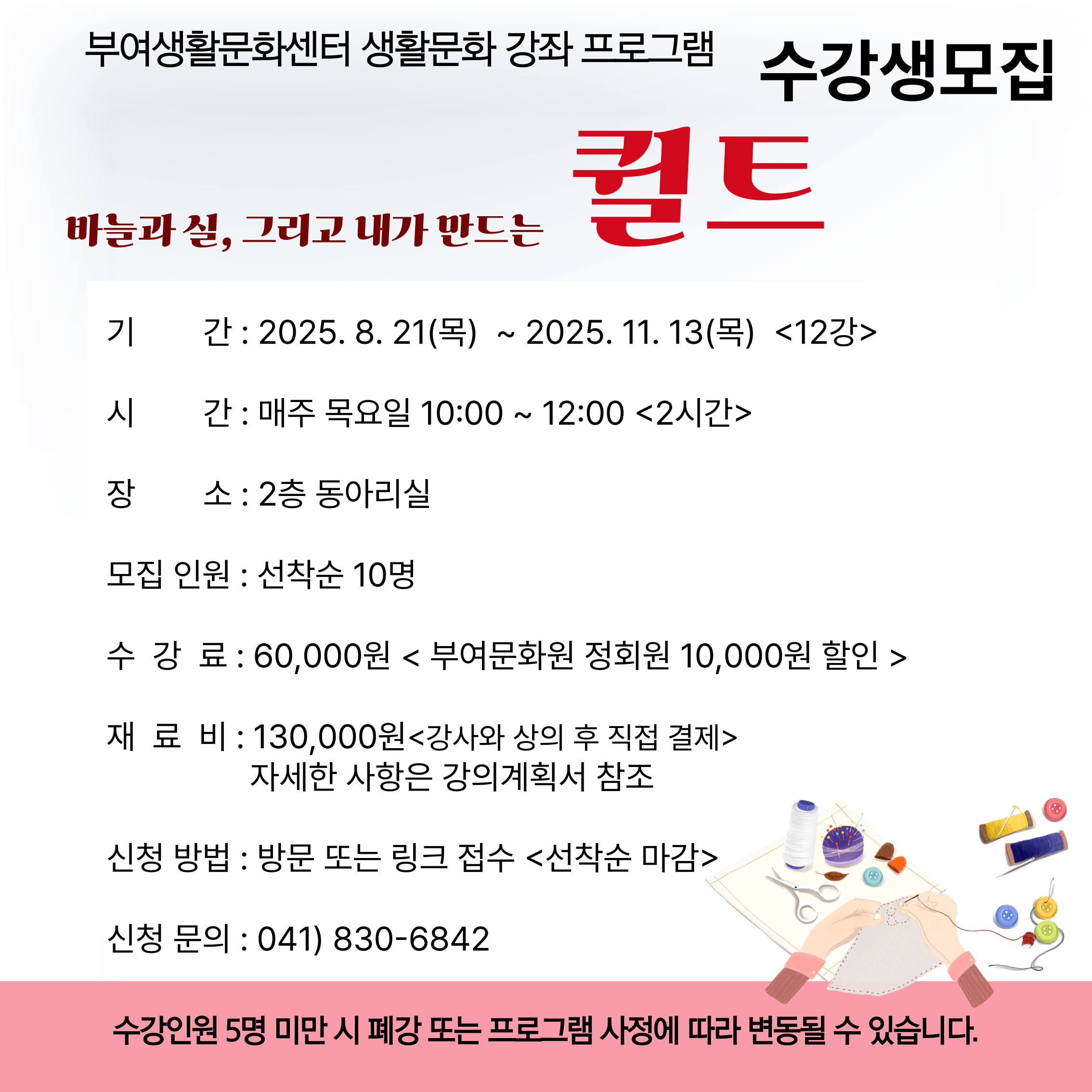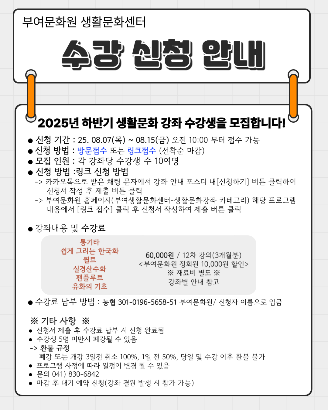 제목 | 2025년 하반기 생활문화강좌 수강생 모집안내 | ||||