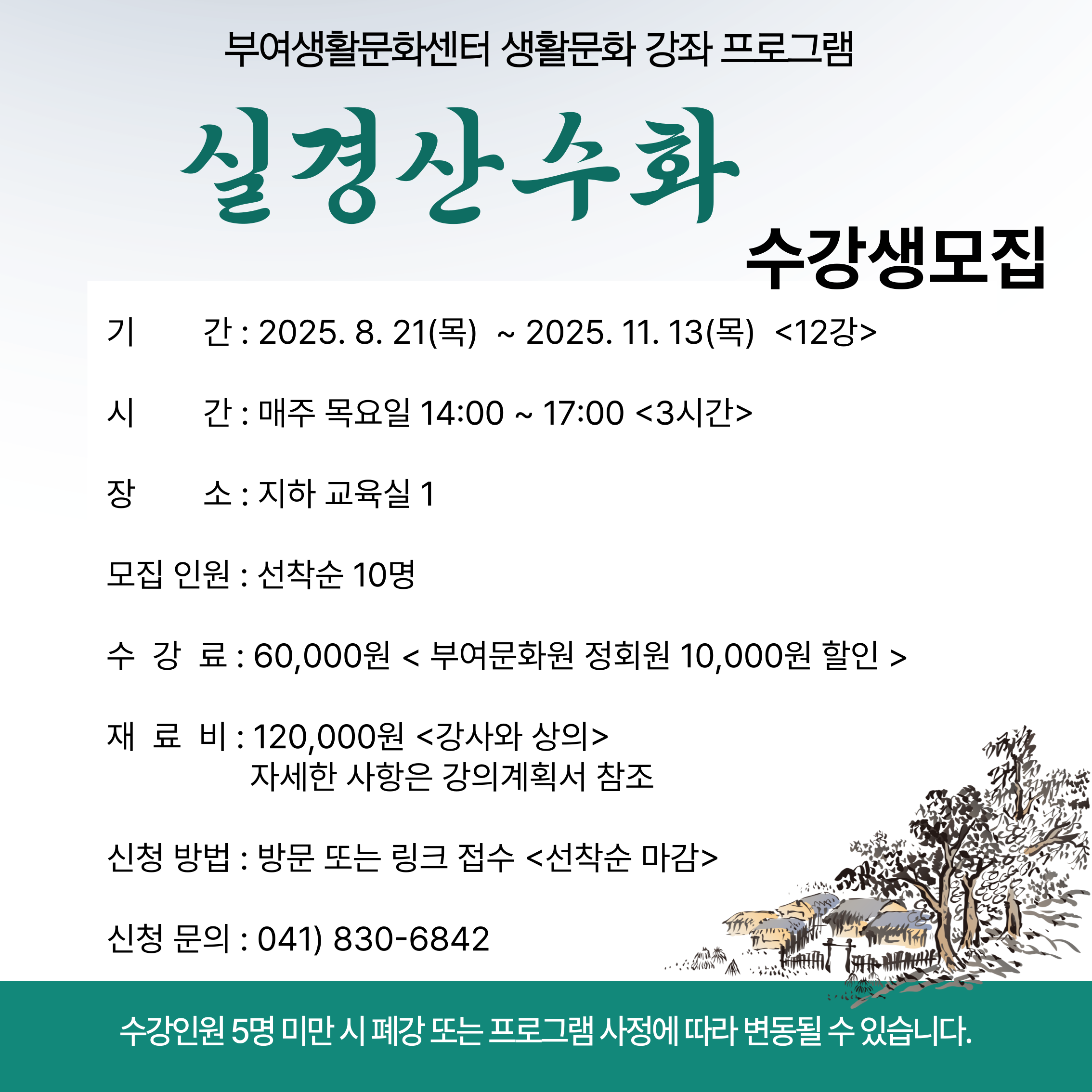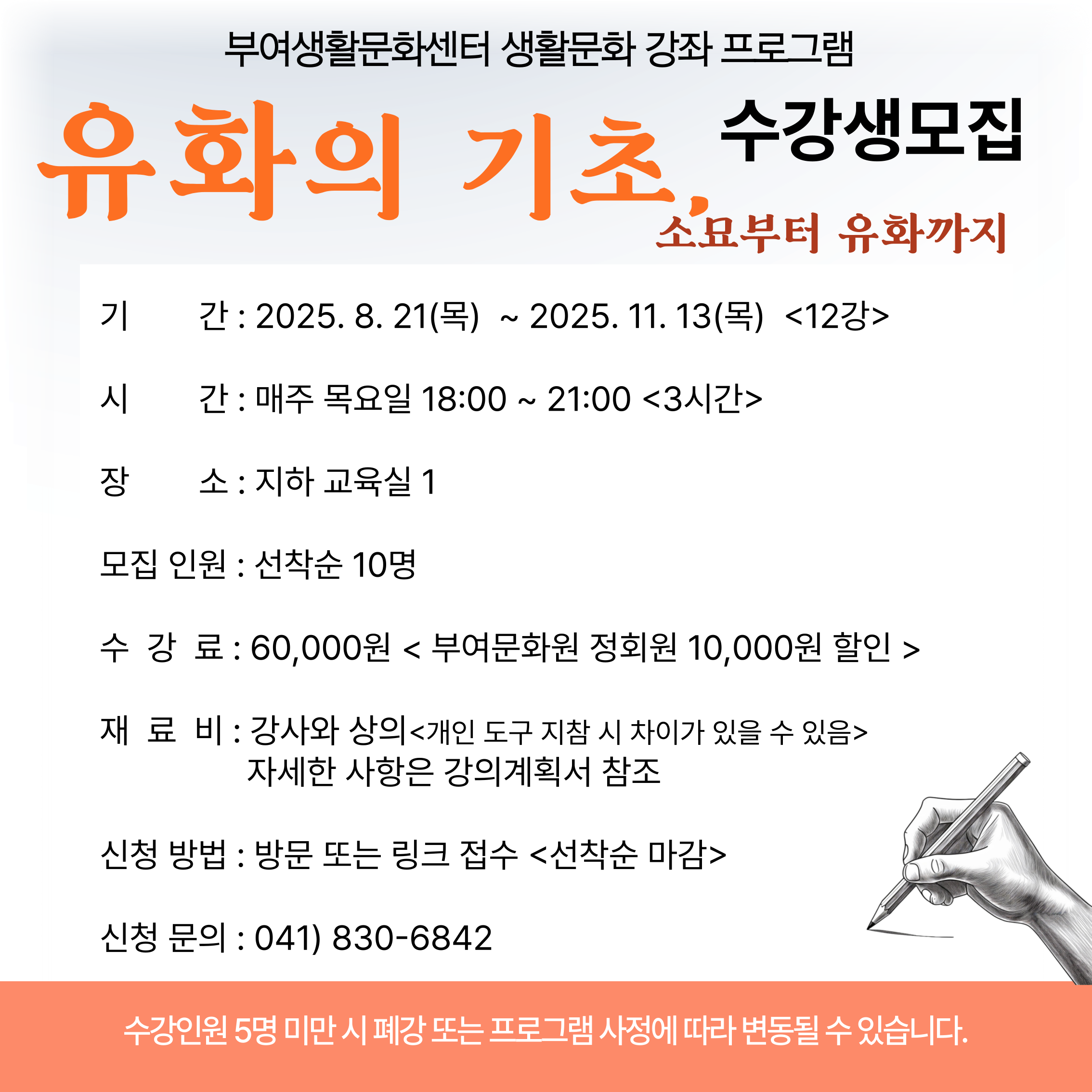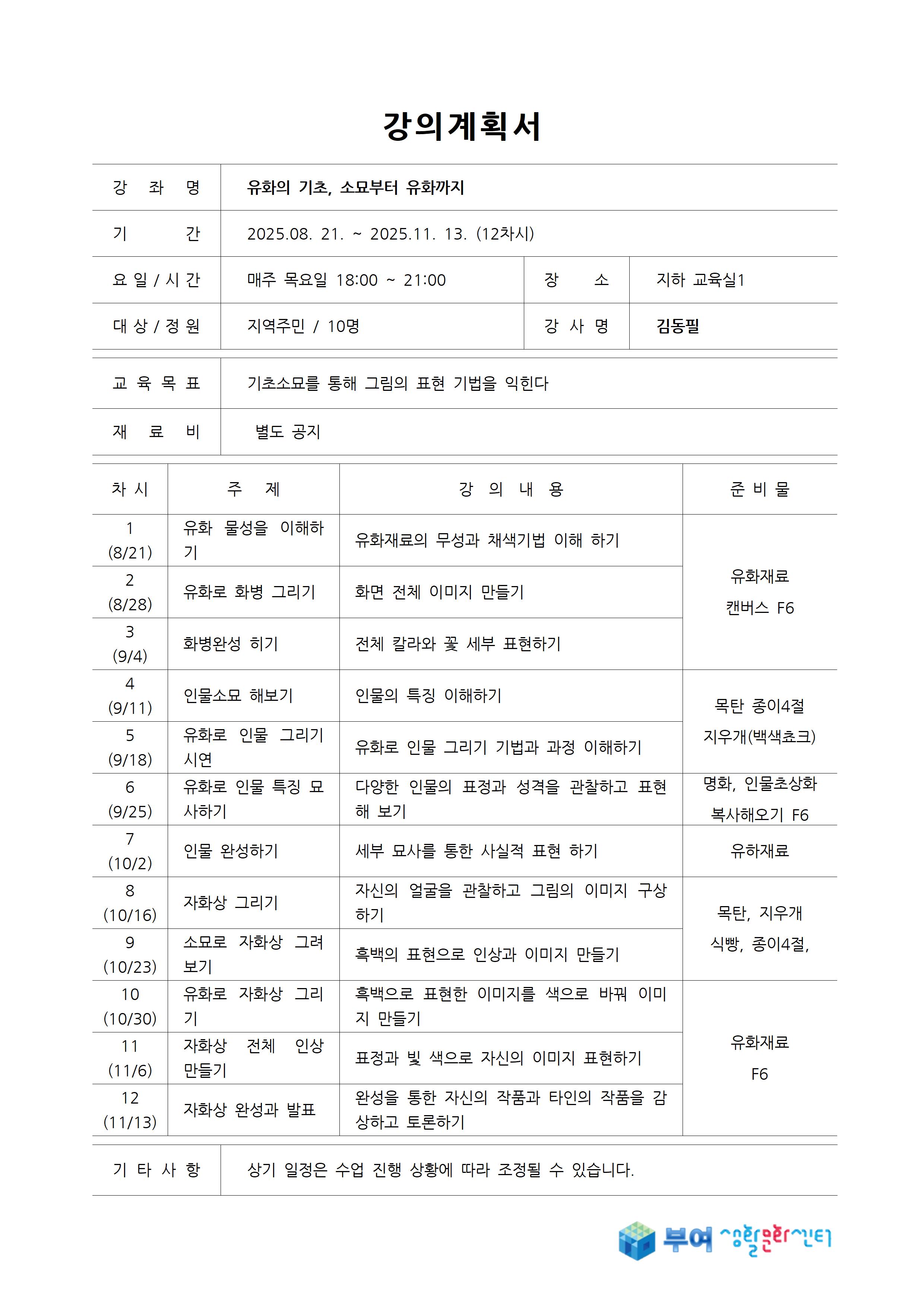 유화의 기초 https://naver.me/GhSPY0qc 수강신청 : 현장방문 및 카카오톡에서 부여생활문화센터 카카오채널 추가!