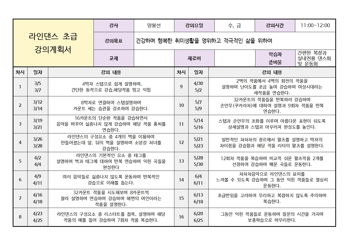 [2025 상반기] 라인댄스 초급 (양봉선)